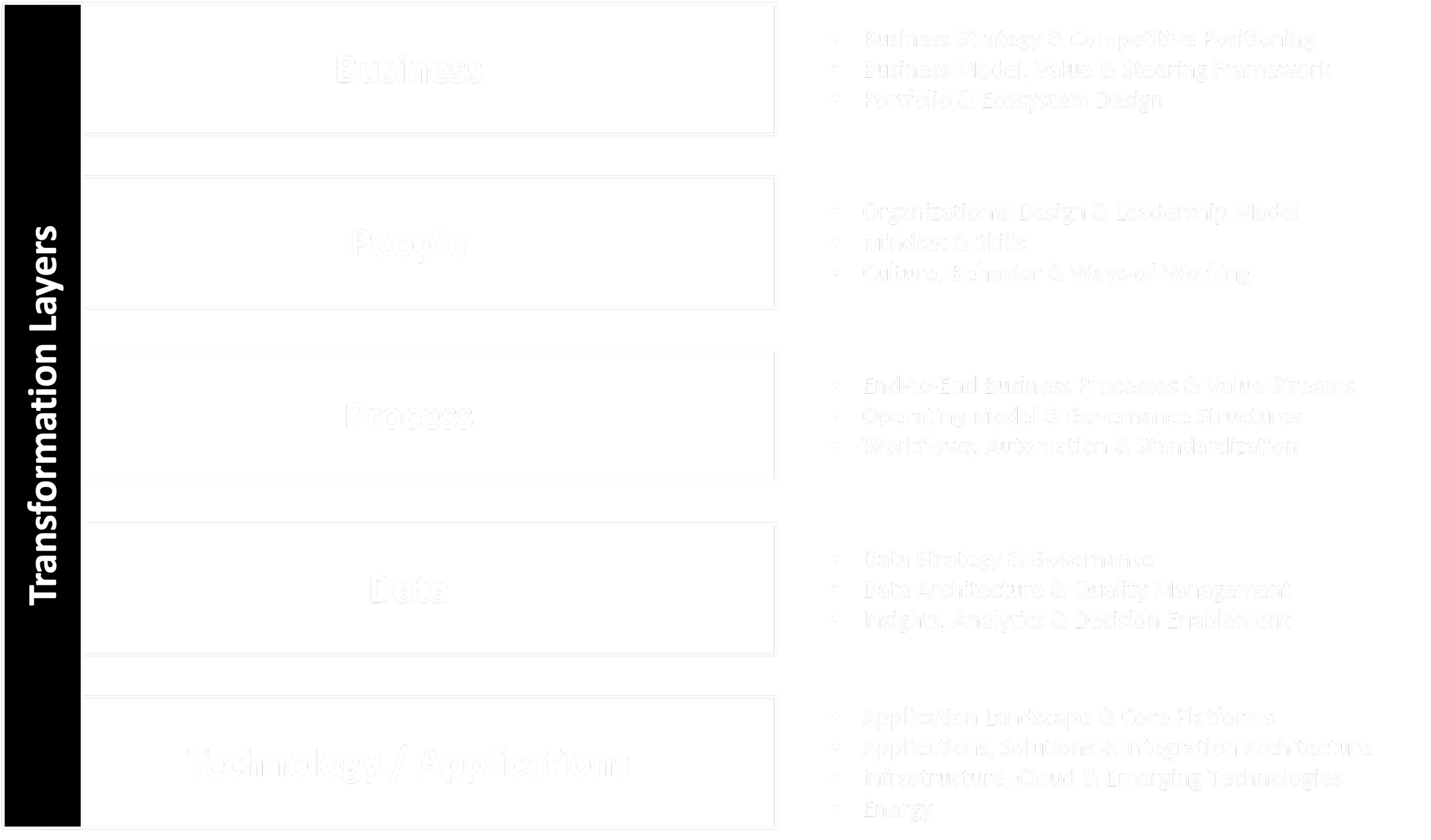 Business transformation is not the optimization of isolated functions. It is the deliberate redesign of the system of value creation. That system is made up of distinct but tightly interconnected layers — from strategy and people to processes, data, and technology.